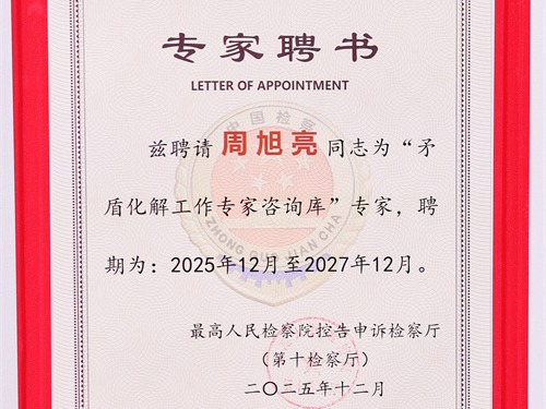 2025年12月,北京冠领律师事务所主任周旭亮、执行主任任战敏同时受聘为最高人民检察院控告申诉检察厅“矛盾化解工作专家咨询库”专家。